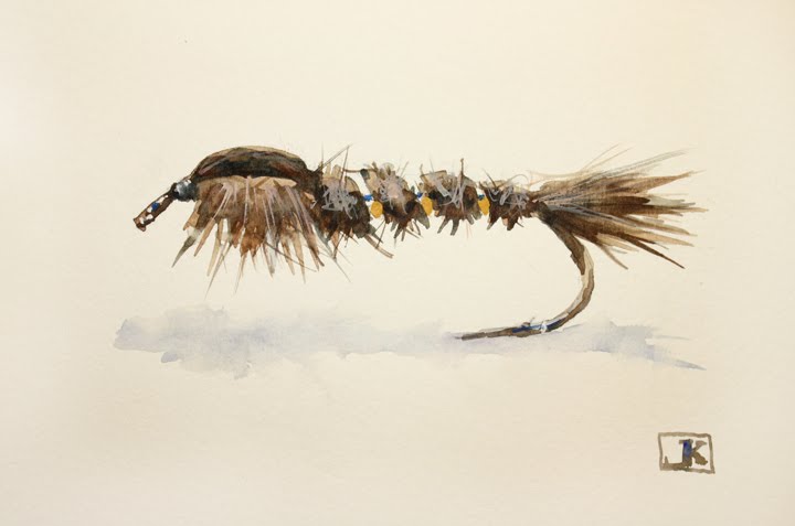 flyartist Posted April 8, 2010 Posted April 8, 2010 Drawing Flies 52_15 Gold Ribbed Hares Ear- Watercolor and Gouache. Original status: Available. Contact me for information. Swing by Jason's blog to check out his rendition of the of the Hares Ear! Tech Info-Decide to create this rendition using a very limited palette. I used ultramarine blue and burnt sienna and white gouache. I started by laying in a medium value wash using a burnt sienna and a touch of ultramarine blue to gray it down a bit. I basically painted in the silhouette of the fly first. I then came back in with a darker mixture and less water an placed the darks. To finish it off I added some white gouache to the mix to add some highlights and the gold color to the rib. The last shape I painted was the cast shadow on the ground. If I had to pick one fly that has the most casting hours it would be the hares ear. This fly is at the top of my list of the "6 must have" flies. View the full article Quote
