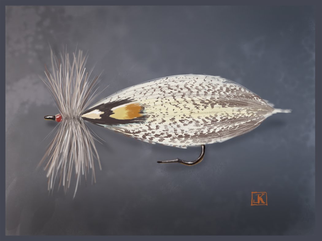 flyartist Posted August 19, 2010 Posted August 19, 2010 Drawing Flies 52_34 Hornberg Original status: email me for information.. Swing by Jason's blog to check out his rendition of a Hornberg! Tech Info- Digital rendering in PhotoShop using Wacom pressure pen and monitor. Decided to do something different this week. I decided to sharpen my digital skills a bit and figured this was as good a time as any to do it. Started by creating a neutral gray background. It is always hard to get started with a big old white canvas staring back at you. I then roughly sketched it the shapes then started blocking in color using my "Chalk" brush. I have created a set of digital sketching and painting brushes that I like to use for this kind of work. I continue building shapes and values, just as I would when I use watercolor and gouache. One has to remember that digital painting is just a tool, the fundamentals are the same. I will say though that there is no "Control Z" or "Undo" key with conventional painting! I have tied a couple of Hornbergs, but I cannot say that I have had great success with them. The Hornberg was developed a retired Wisconsin Conservation Warden named Frank Hornberg. The fly has been known to imitate a large sedge or a small minnow. Knowing that Frank was from Wisconsin, my bet is that the later was what he was striving for. The Hornberg can range from "Real Scruffy looking" to more refined as I have shown. I chose this look because I new time would be a factor when rendering the mallard. I recall seeing seeing a while back a rendition of a Hornberg where the the tips of the mallard were brought together and glued with some head cement. That is the way I decided to render it. There is nothing like jungle cock as great method to draw your eye to the center of interest on this fly! View the full article Quote
